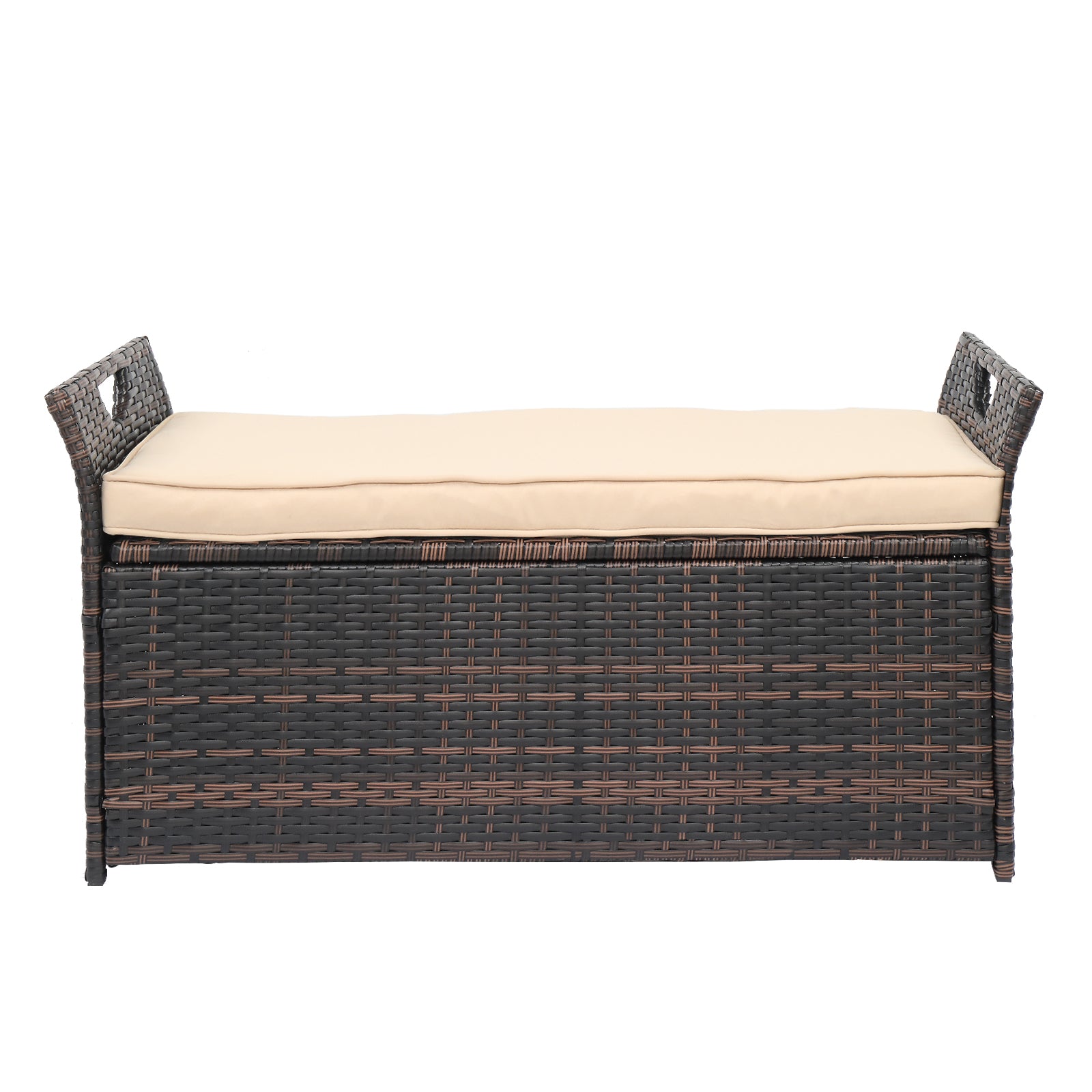 Perfect for storing shoes, clothes, blankets, or books, it also serves as a comfortable seat with a thick beige cushion.