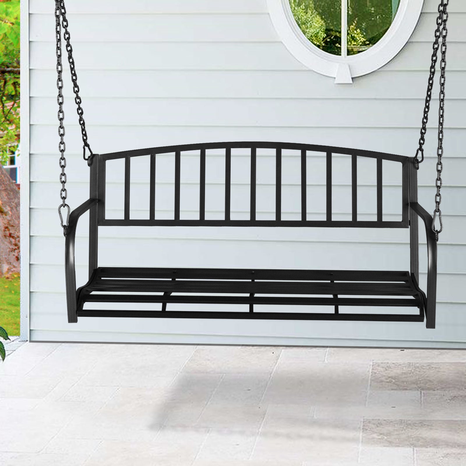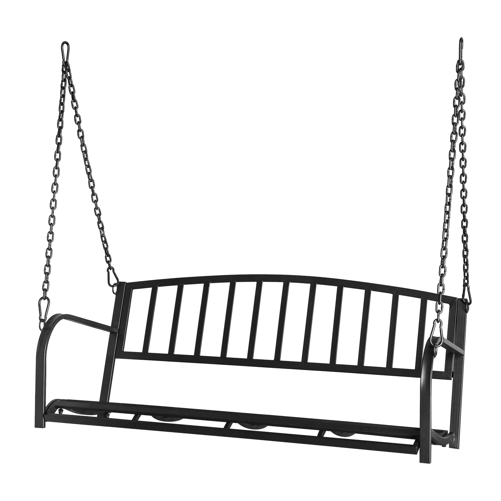 Add classic charm to your outdoor space with this iron swing seat, featuring a vertical bar backrest and a durable chain suspension system.