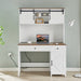 Upgrade your home office with this rustic farmhouse desk, featuring a hutch, two sliding drawers, and multiple storage cabinets to keep your workspace neat and organized.