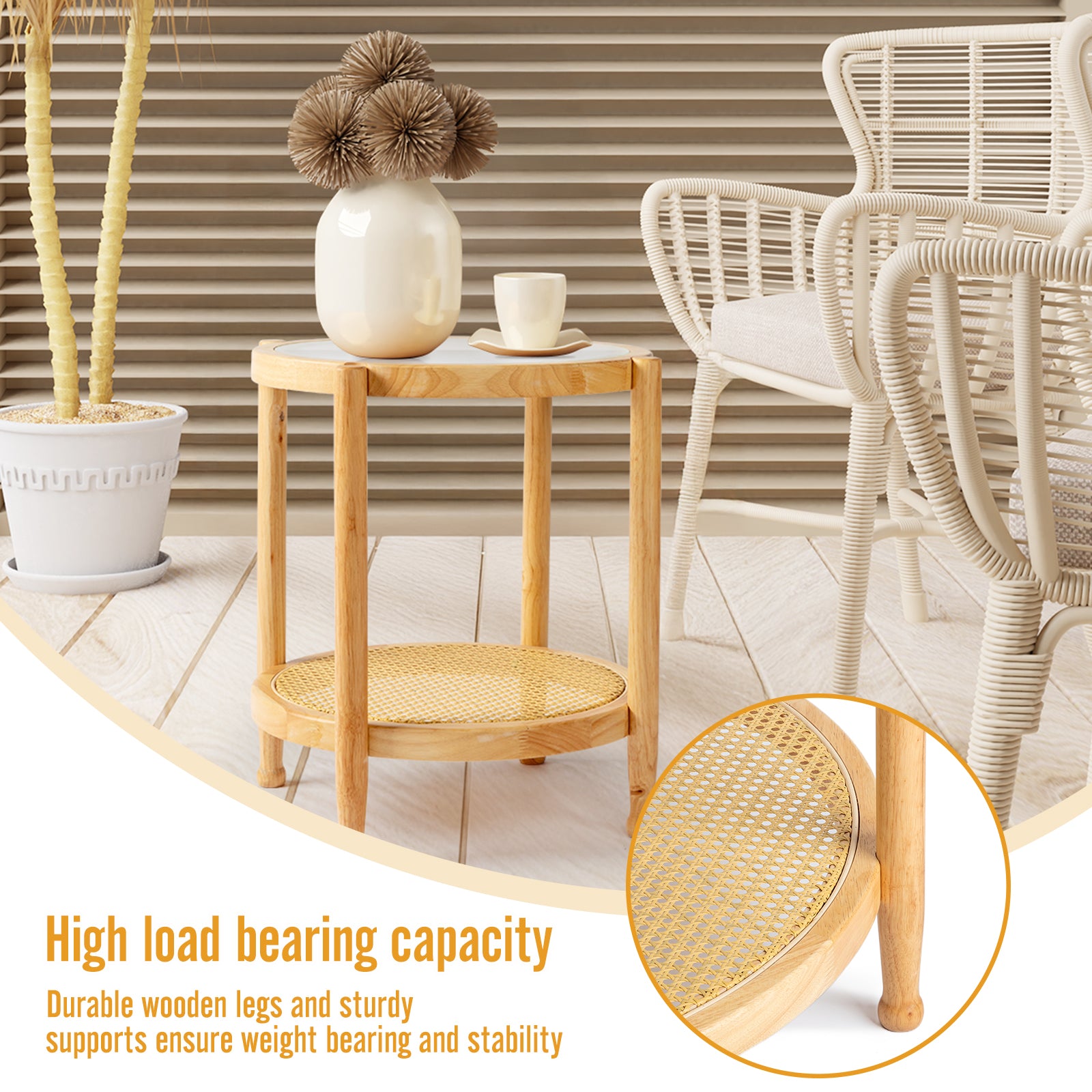 The hand-woven lower shelf provides extra storage or display space, perfect for books, plants, or décor.