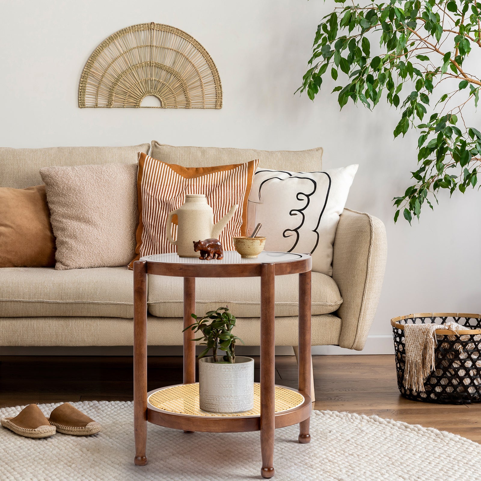 [Authentic Hand-Woven Rattan Shelf] The lower natural rattan shelf is meticulously handcrafted, bringing organic boho charm and extra storage space to any living space.