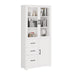 Upgrade your storage and style with the HAOYYE white display cabinet. Designed for both functionality and visual appeal, this tall unit features a combination of open and closed storage with tempered glass doors, three smooth-gliding drawers, and a concealed lower cabinet. Constructed from durable triamine board veneer, it’s water-resistant and ideal for humid environments.