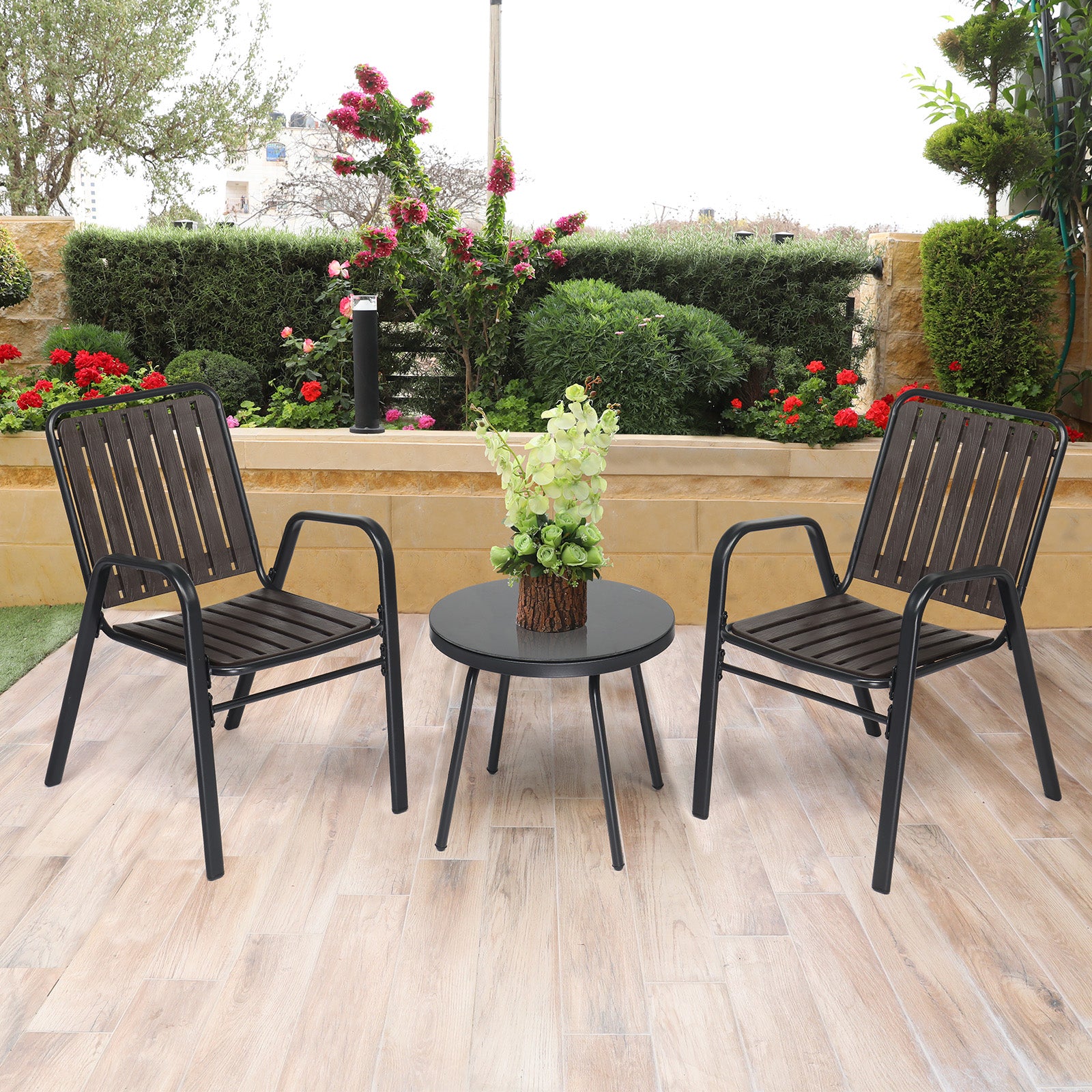 Crafted with a sleek black steel frame and coffee-toned PP slats, the set offers a sophisticated look that complements any outdoor decor.