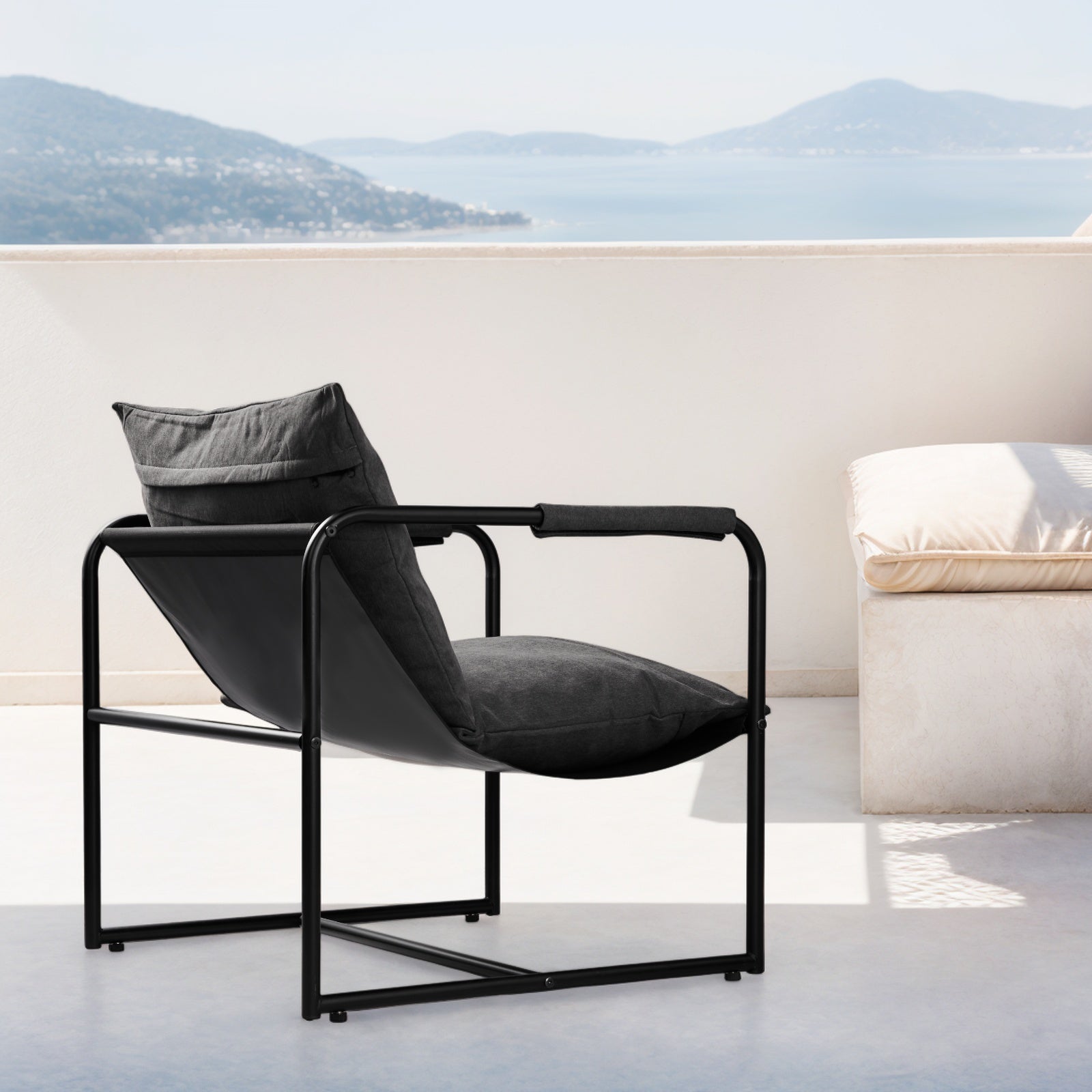 The elegant black iron frame complements the gray cushion and black Oxford cloth, creating a modern, sophisticated look that fits any decor.