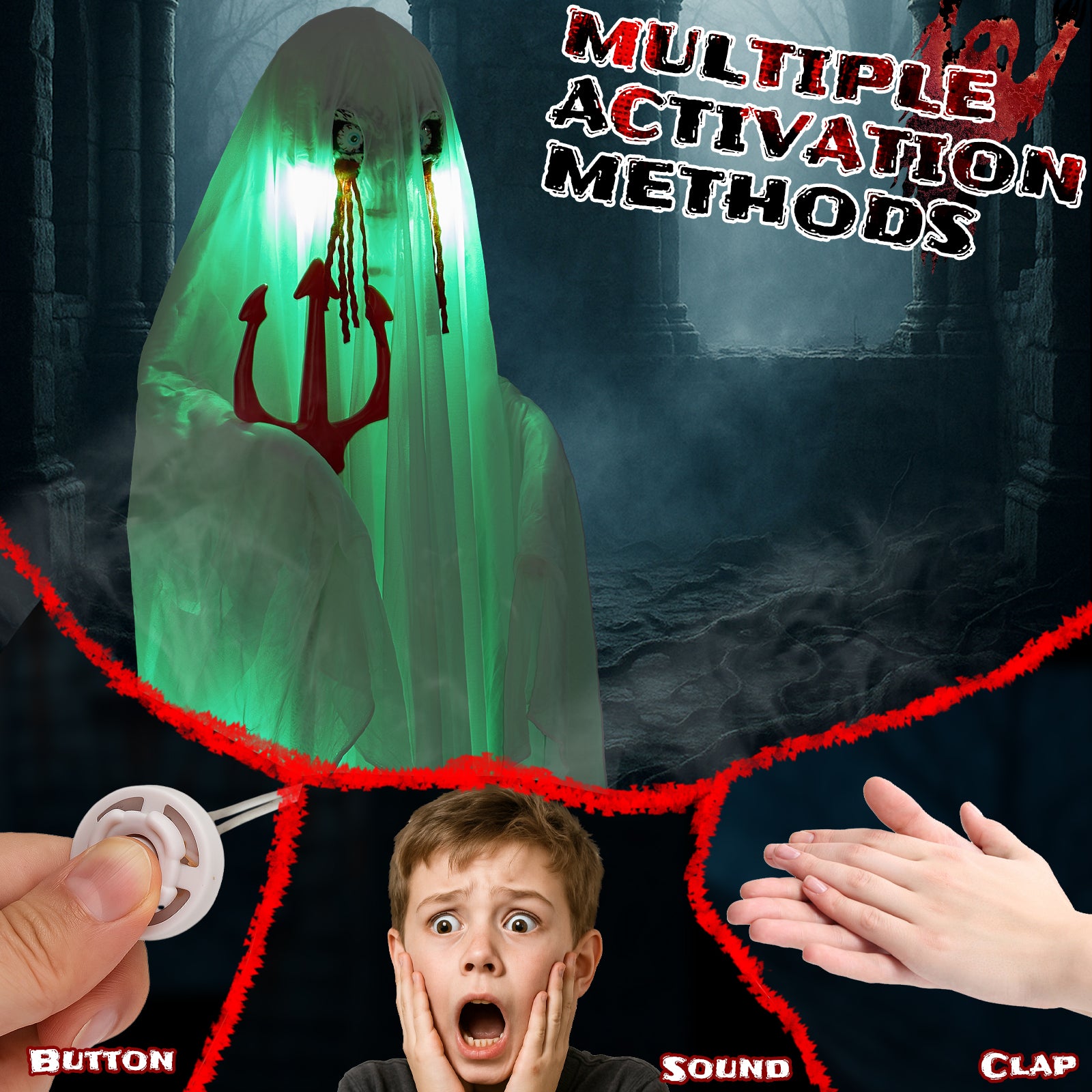 Responds to noise with glowing green body and eerie sounds, startling guests and creating a spooky Halloween atmosphere.