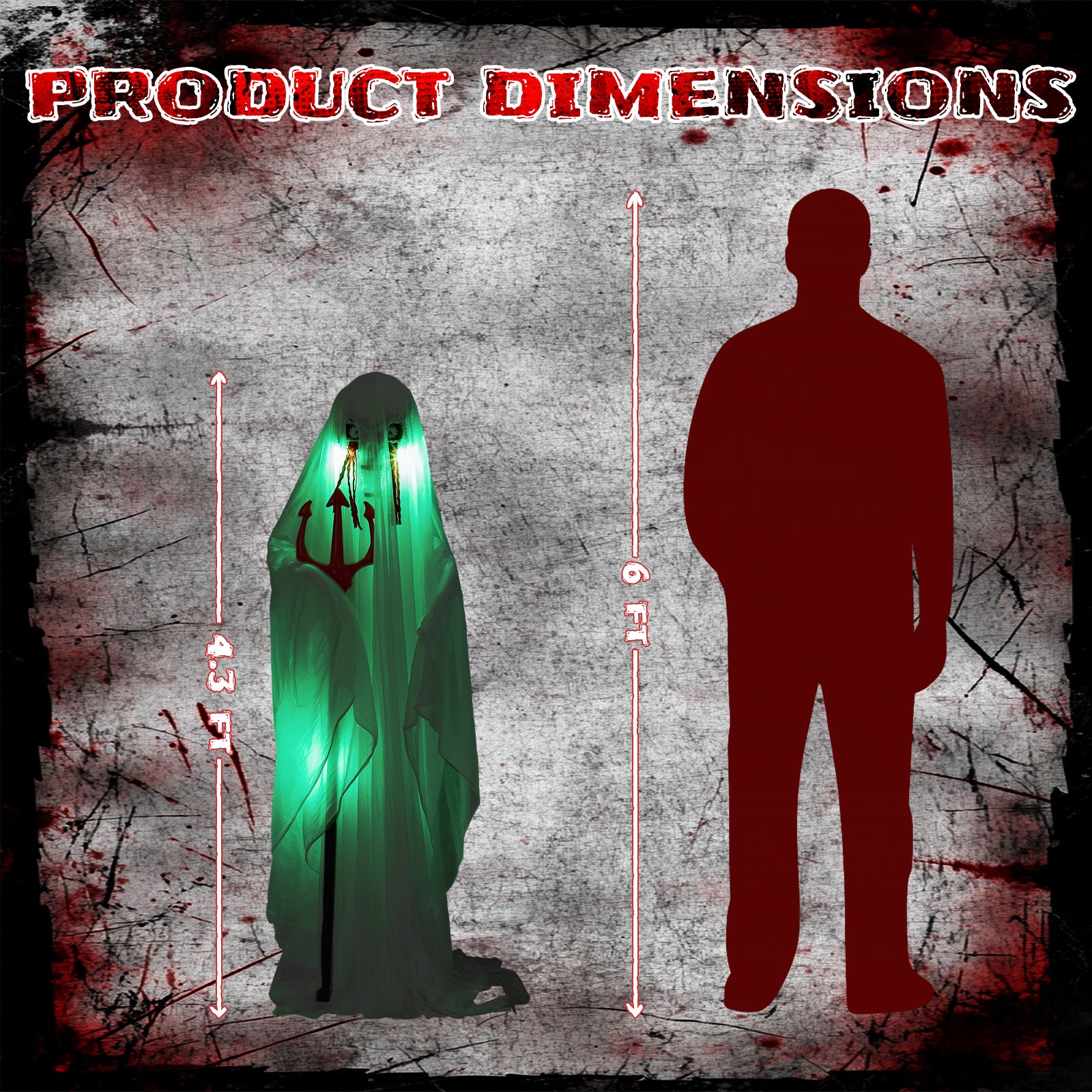 Standing at 4.3 feet, this ghost serves as a dramatic centerpiece for porches, lawns, or haunted house displays.