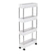 The slim 4-tier structure fits perfectly into small spaces like closets, kitchens, bathrooms, garages, laundry rooms, offices, or even between appliances.