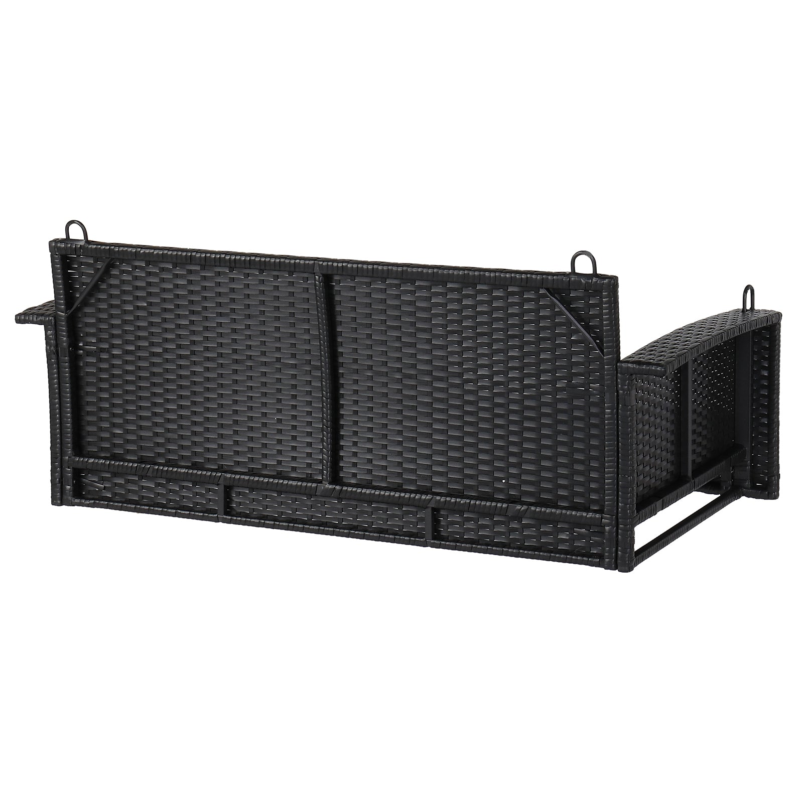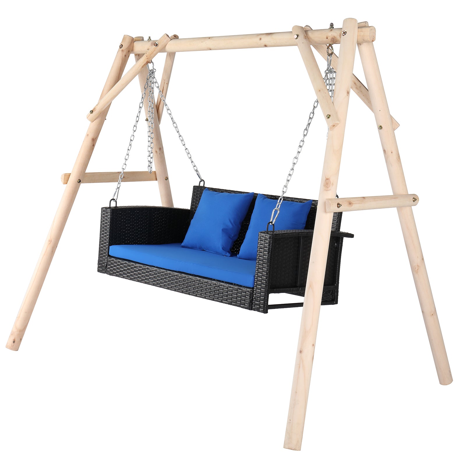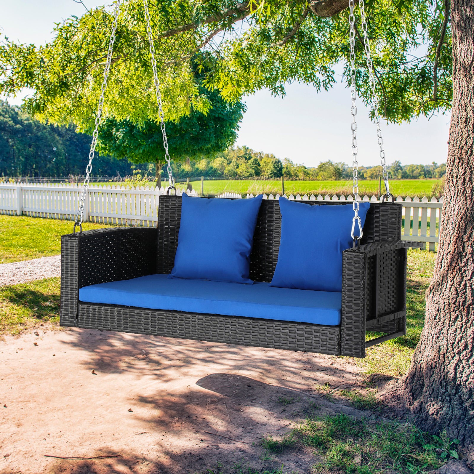 Package Includes: 1 x Black Rattan Swing, 1 x Blue Seat Cushion, 2 x blue throw pillows, 2 x Silver Chains, 6 x Silver Locks, 1 x Hardware Assembly Accessories, 1 x English manual