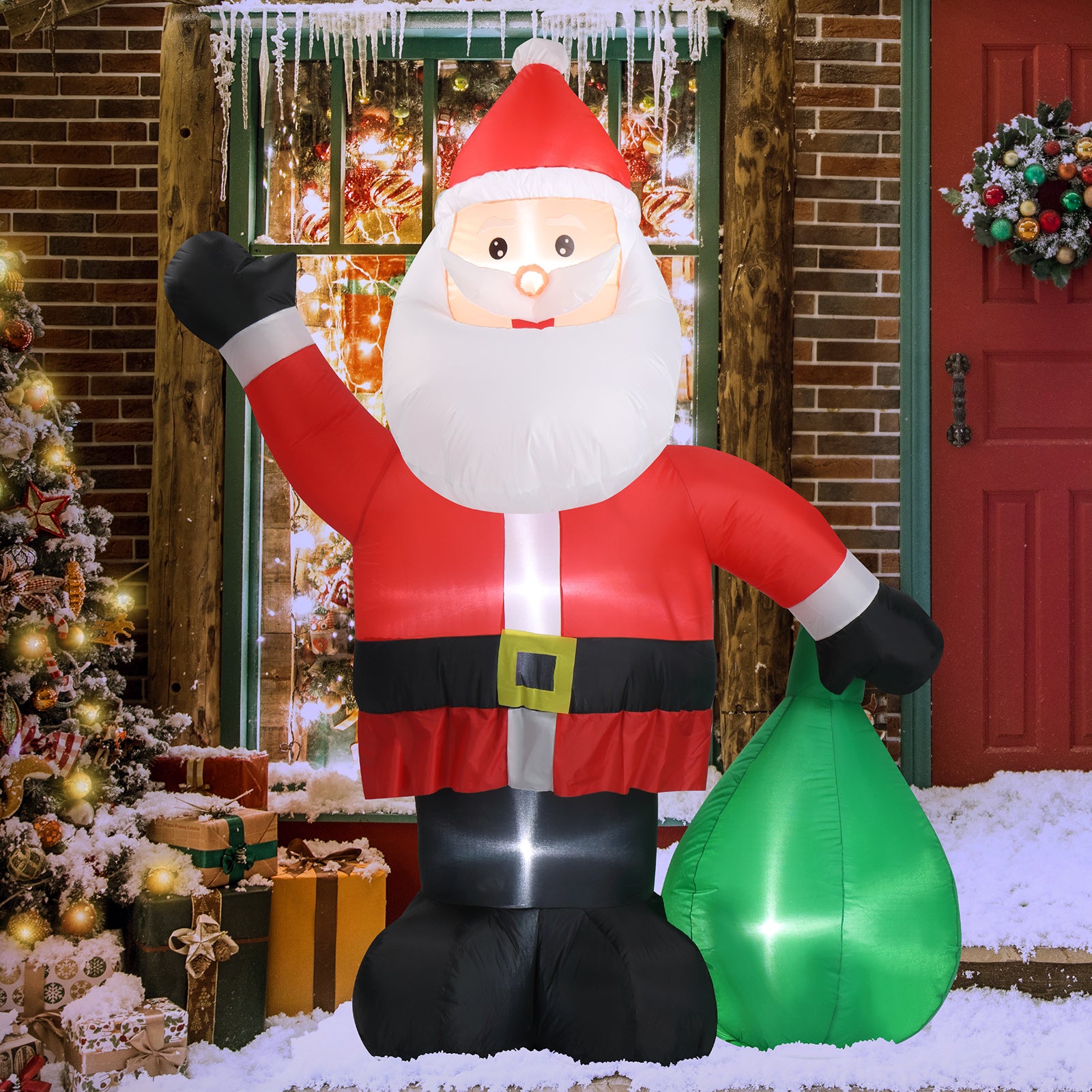 Bring festive cheer to your yard, garden, or indoor space with this large inflatable Santa Claus, holding a gift bag and waving to guests, creating a welcoming holiday atmosphere.