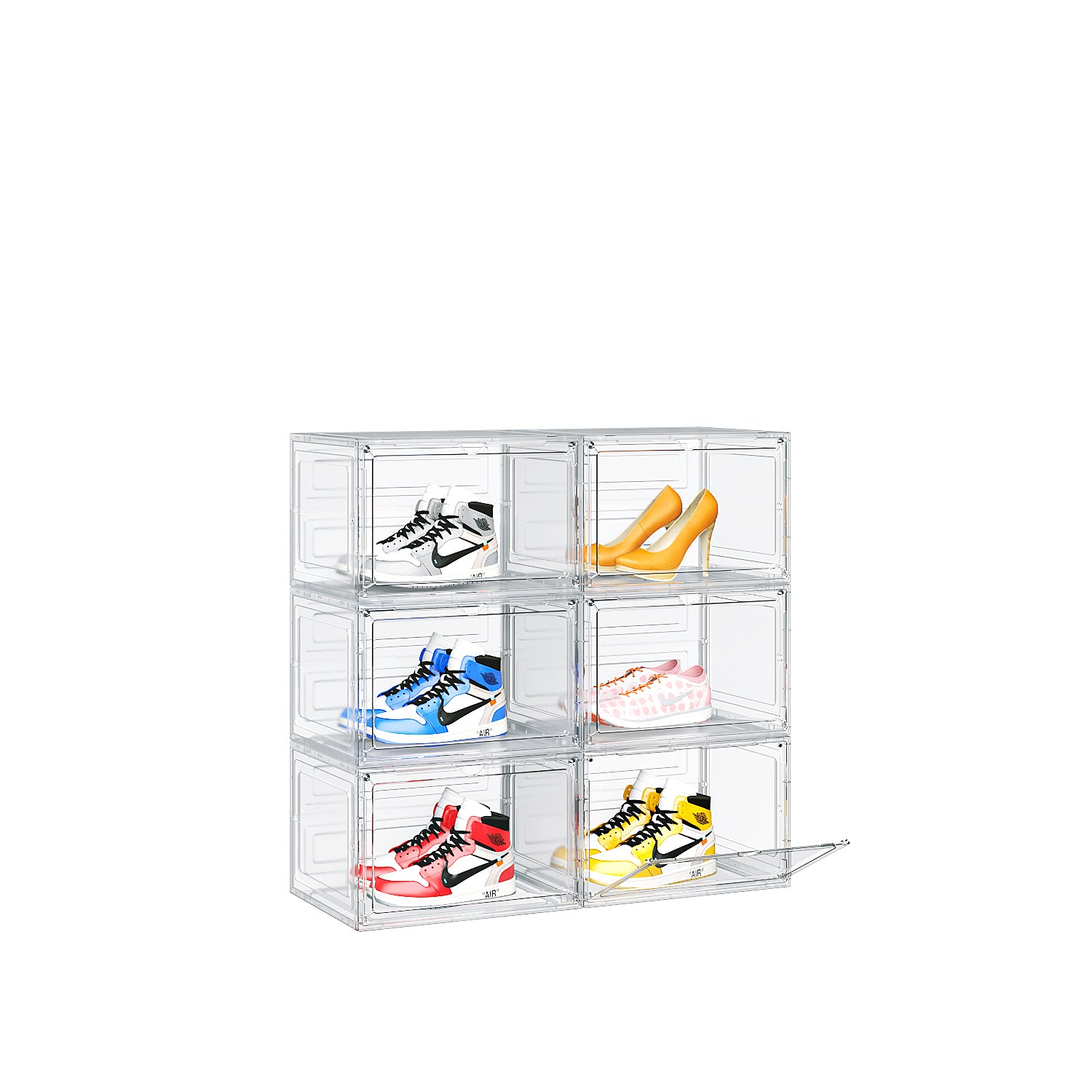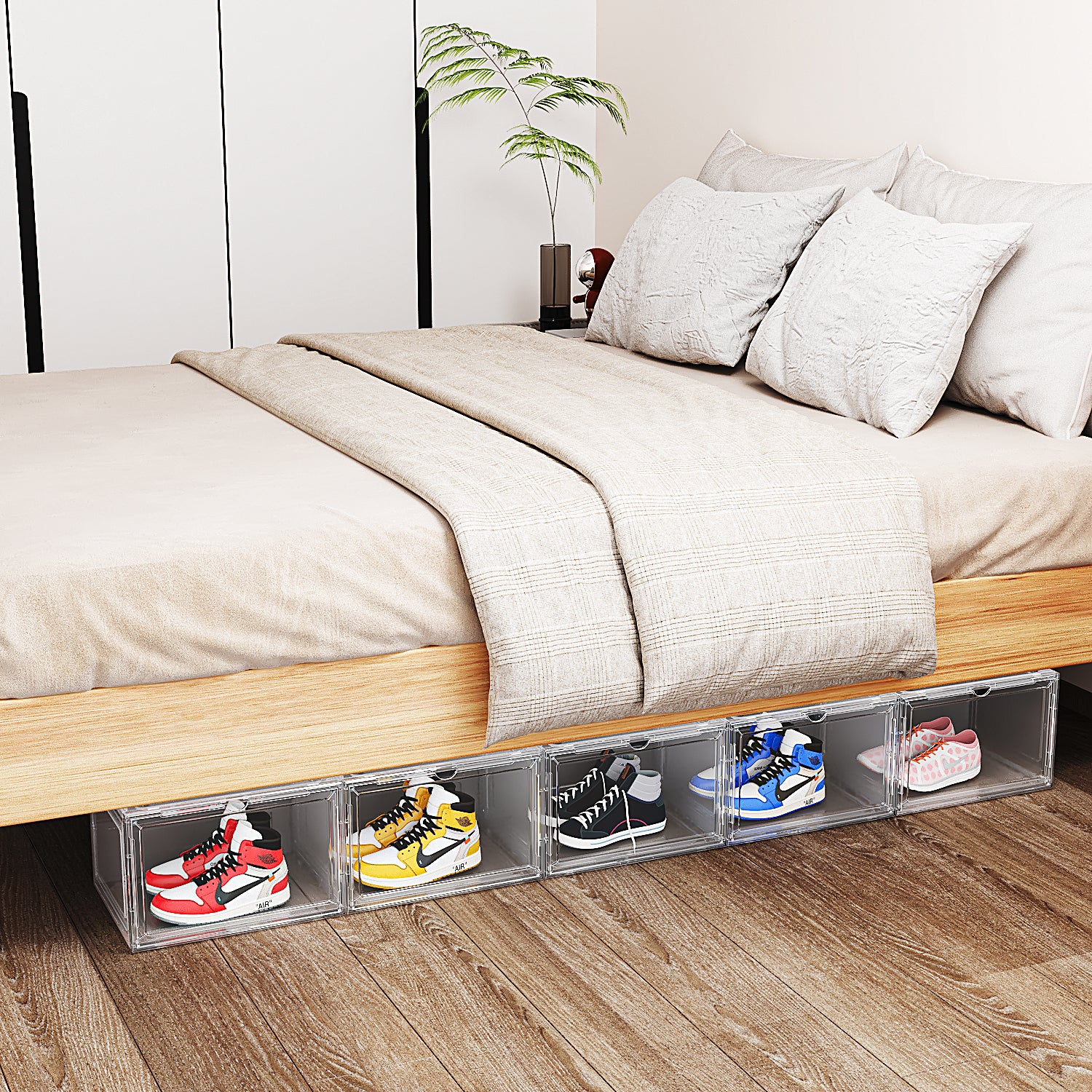 Freely stack and combine these large shoe boxes to fit your available space vertically or horizontally, ideal for closets, entryways, under beds, or shelves.
