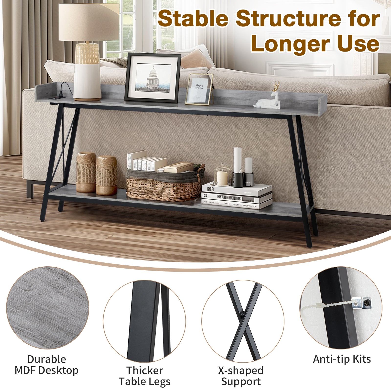 Stay connected with ease—this console table features a built-in power station with 2 plug outlets and 2 USB ports to charge all your devices conveniently.