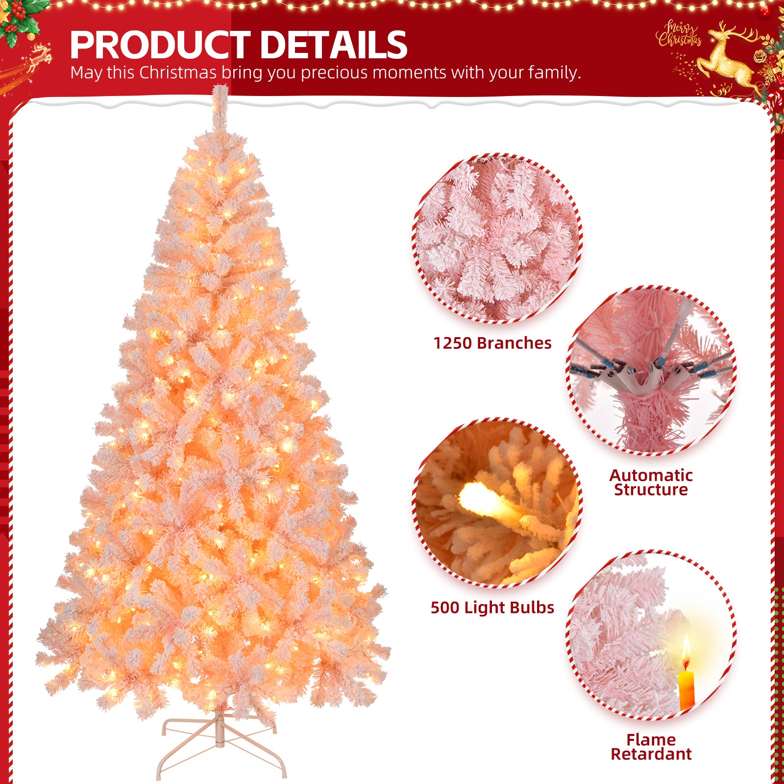 Transform your home into a magical holiday wonderland with this 8 FT prelit Christmas tree featuring realistic snowy pink branches and 500 warm white LED lights, perfect for your living room, entryway, or office to instantly create a festive atmosphere.