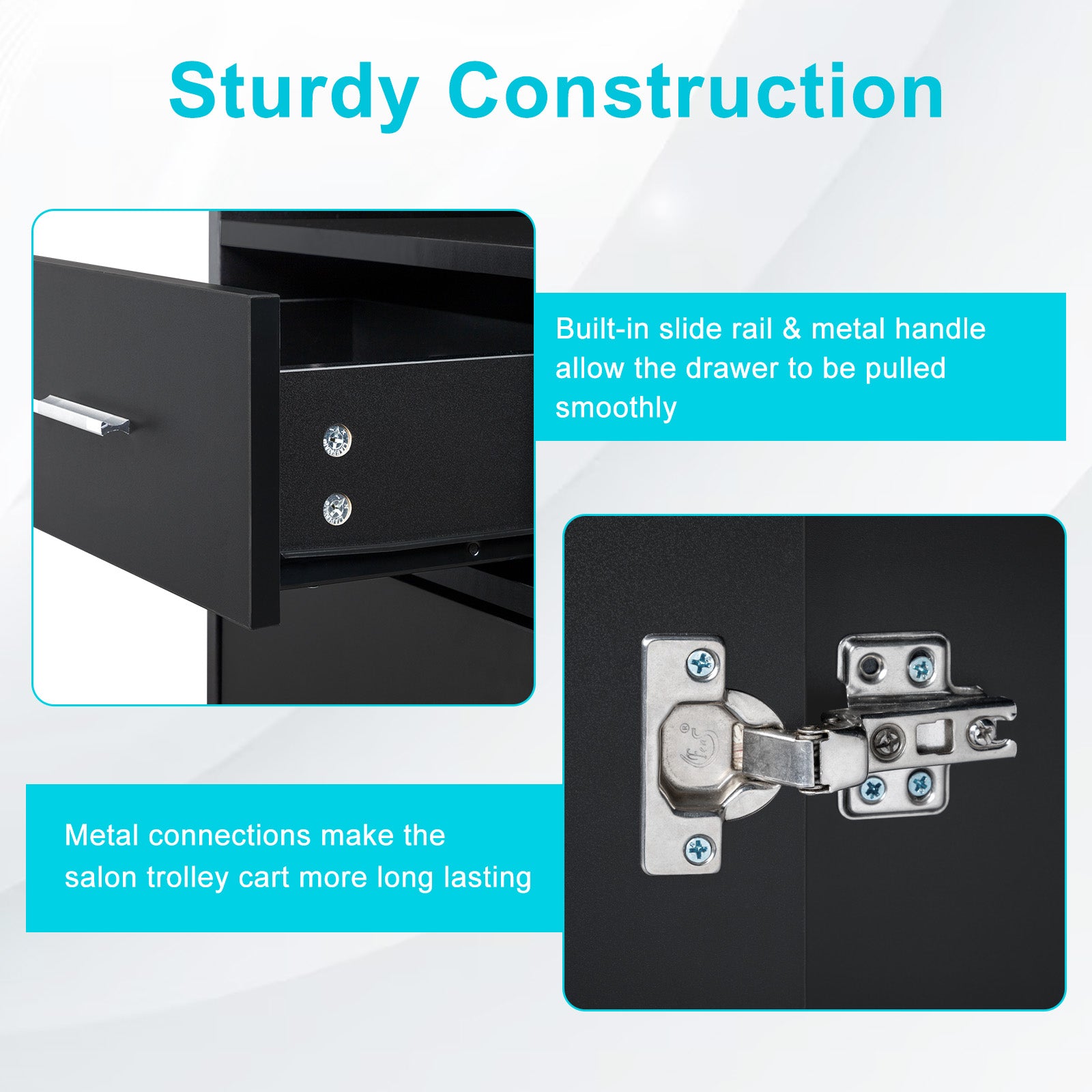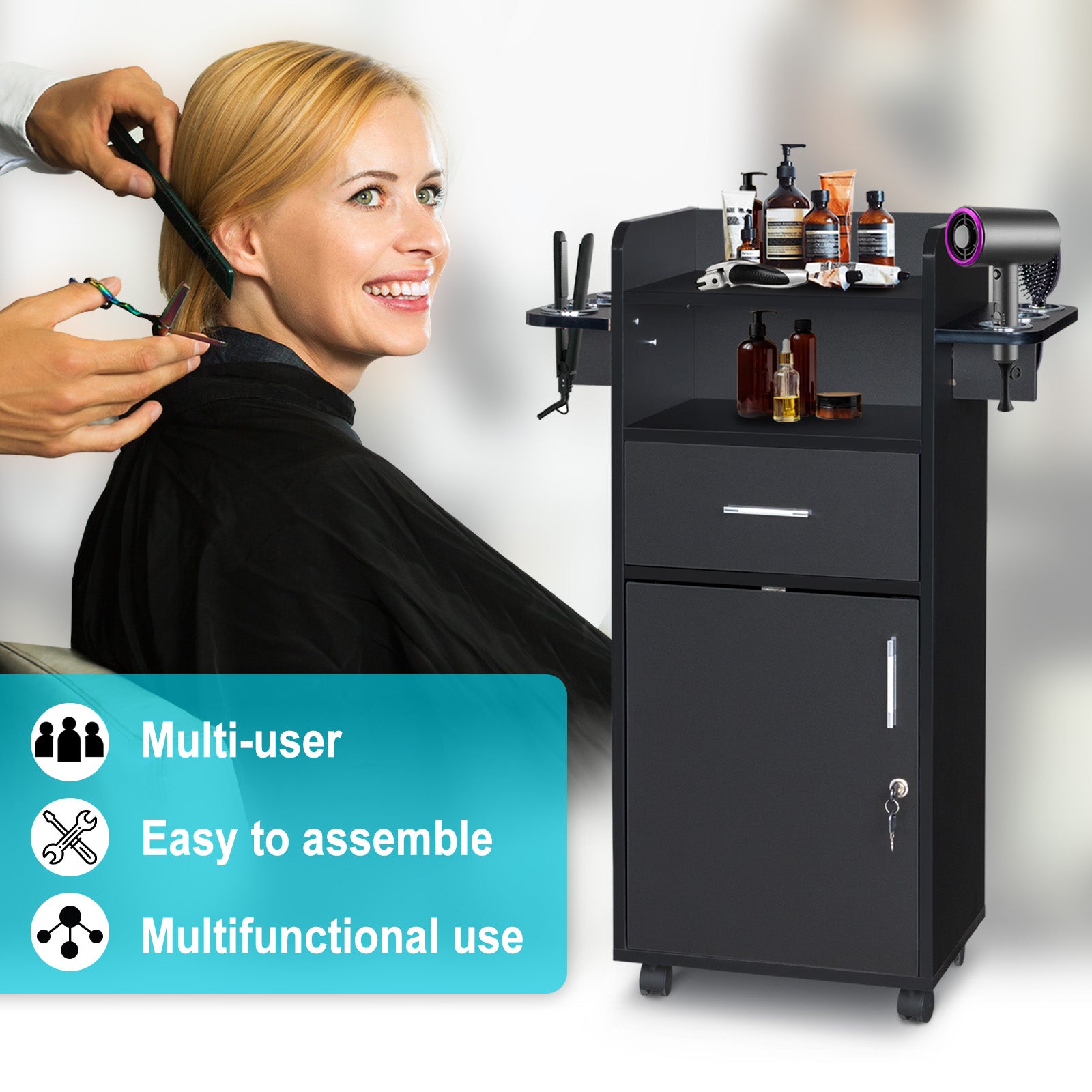 [Ample Storage Capacity] This salon trolley features a convenient slide-out drawer and a spacious lockable base cabinet, providing easy access and secure storage for all your essential styling tools and products.