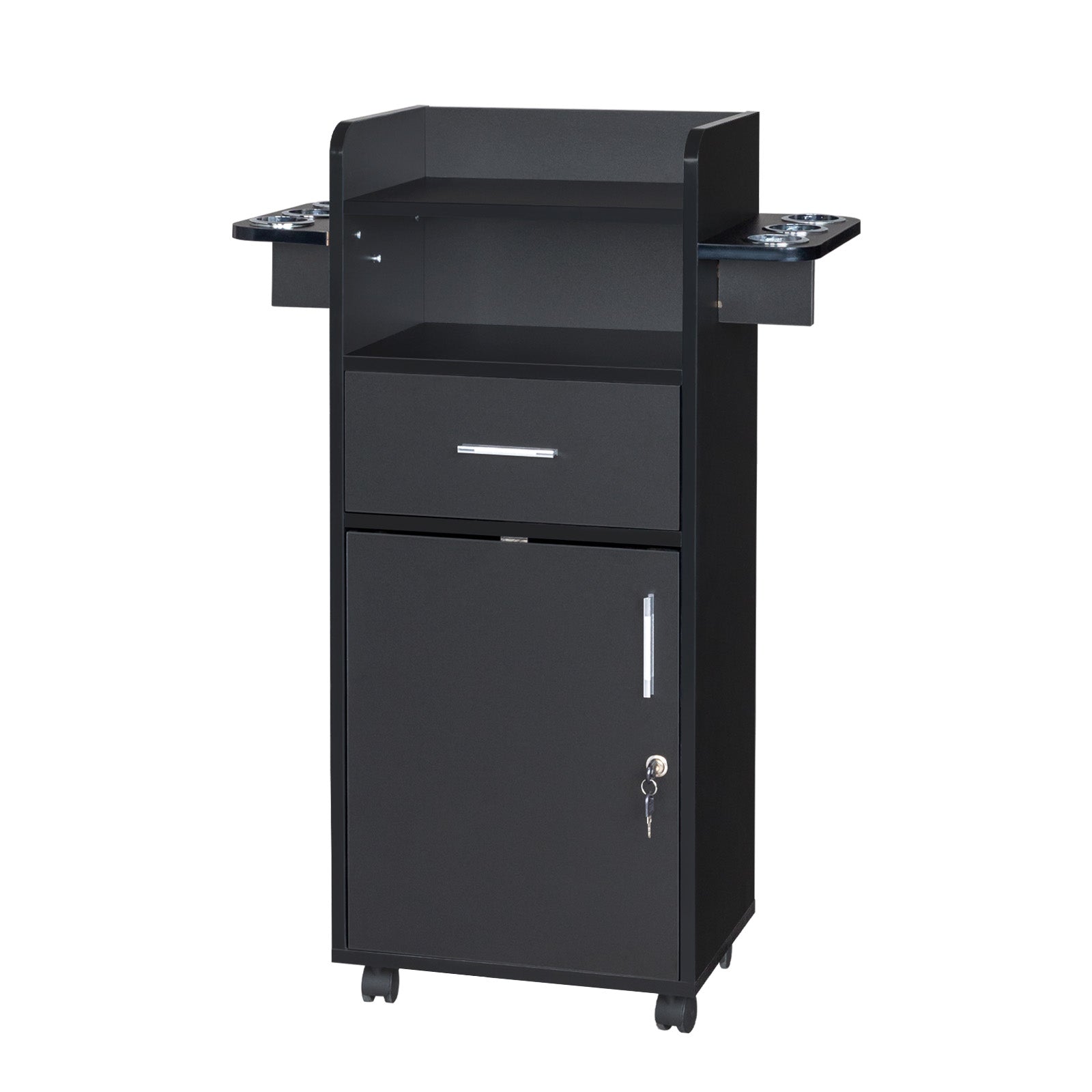 This salon trolley offers ample storage with a slide-out drawer and a spacious lockable cabinet, perfect for organizing your styling essentials and securing valuables.