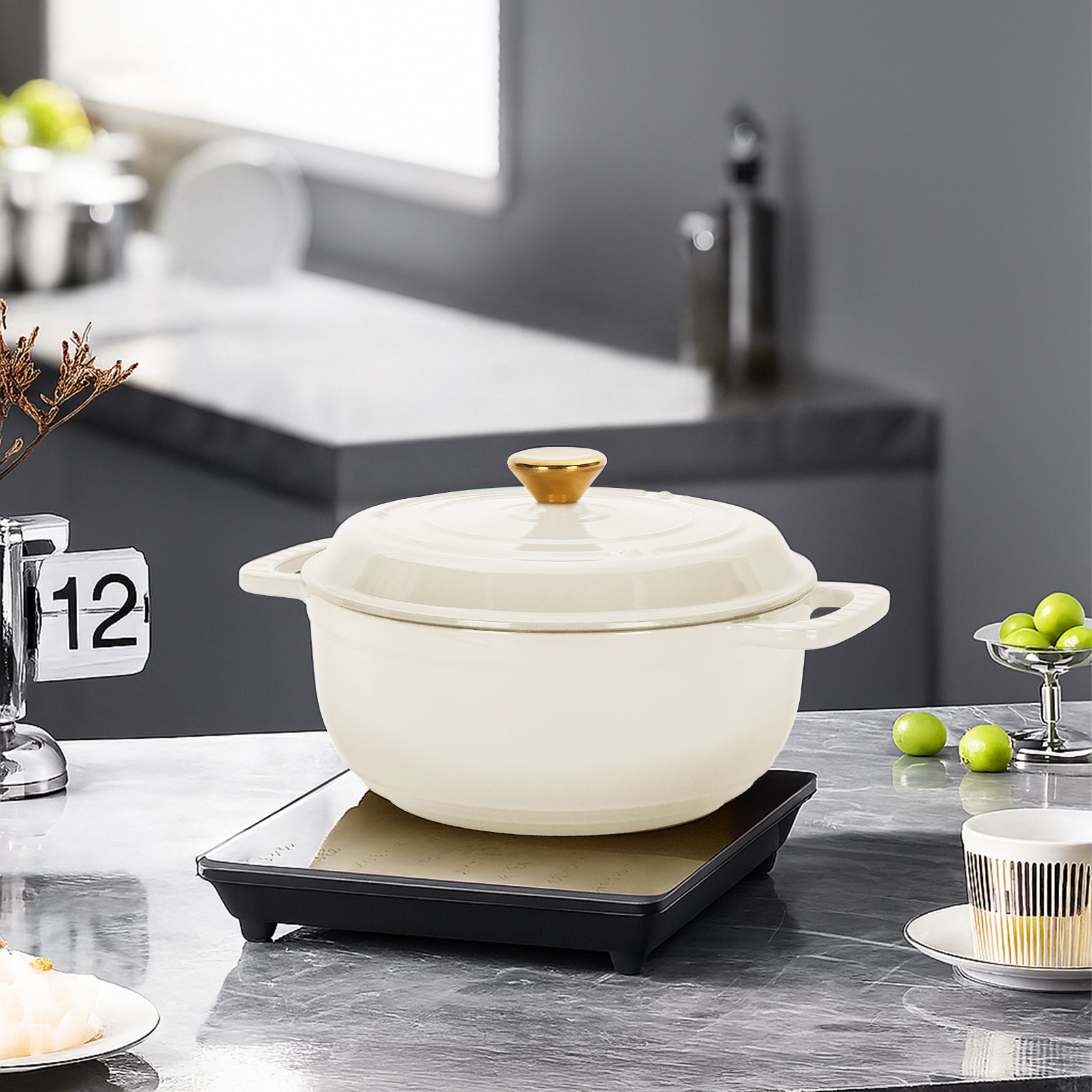 Designed for temperatures from 100-260℃ (212°F - 500°F recommended), this pot works with ovens, gas stoves, induction cooktops, and grills. It handles frying, baking, stewing, boiling, and more. Double-sided heat-resistant handles with textured grips, paired with included anti-slip silicone gloves, make transferring and handling safe and easy.