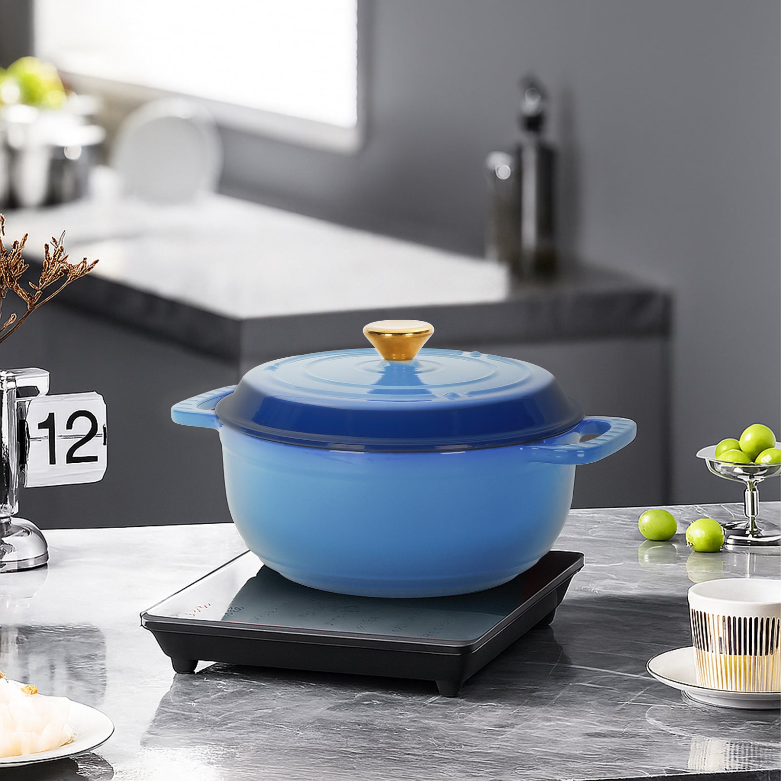 Made from thickened cast iron weighing 16 pounds, this 7.5-quart pot features a double-layer enamel coating with a high-gloss exterior and non-stick interior that resists stubborn stains. Its wide, stable base ensures tipping resistance, making it perfect for families of 7-8 people. FDA-certified enamel guarantees safe and reliable cooking.