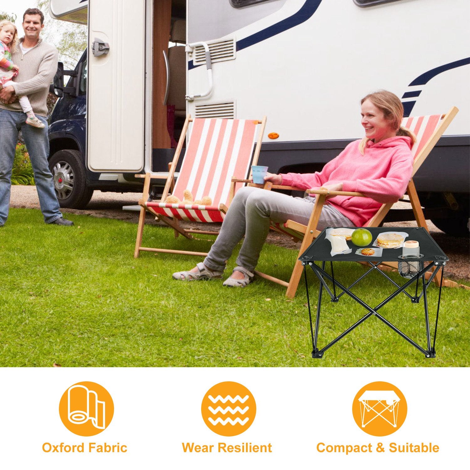 Durable 600D polyester tabletop is tear-proof, scratch-resistant, and waterproof for long-lasting outdoor use.