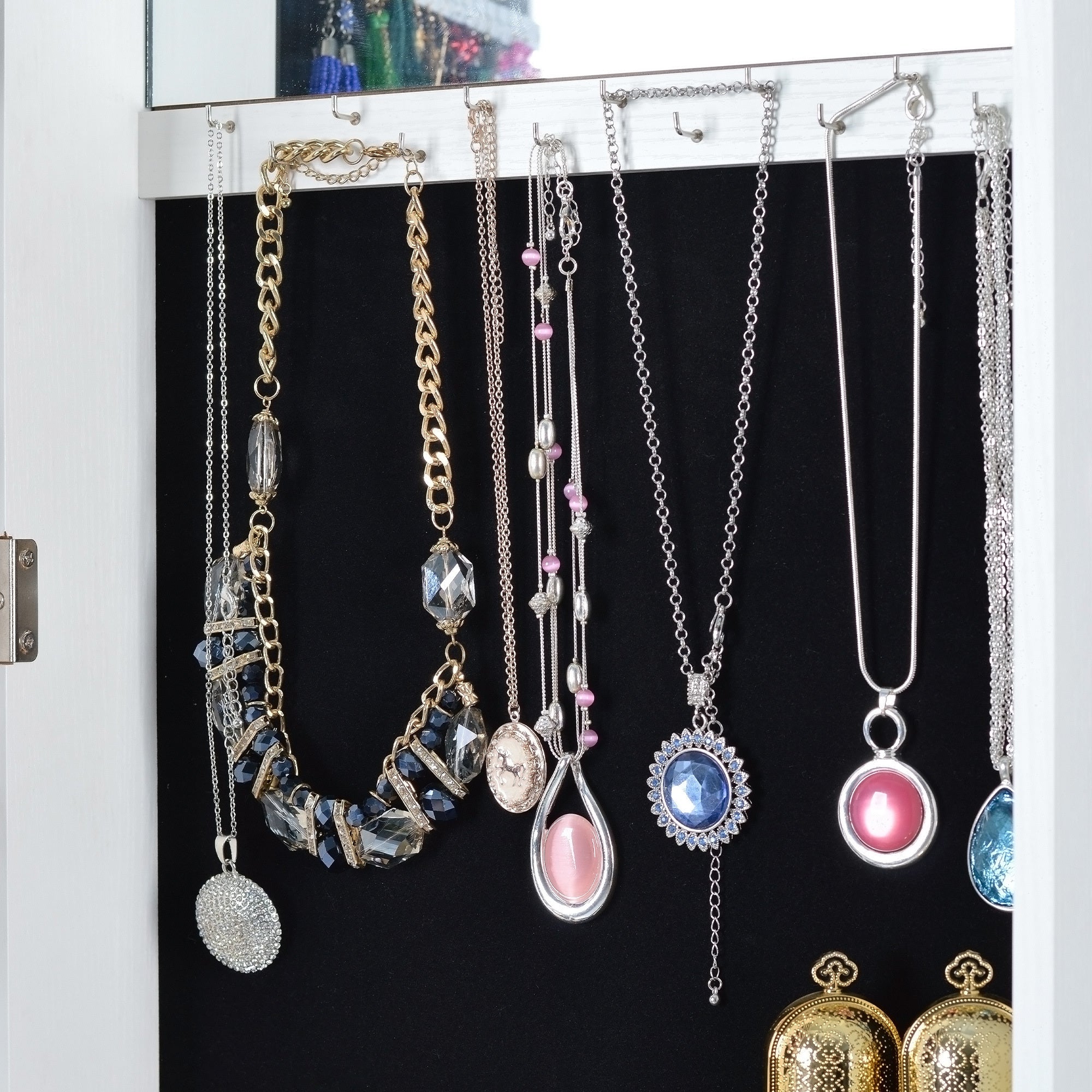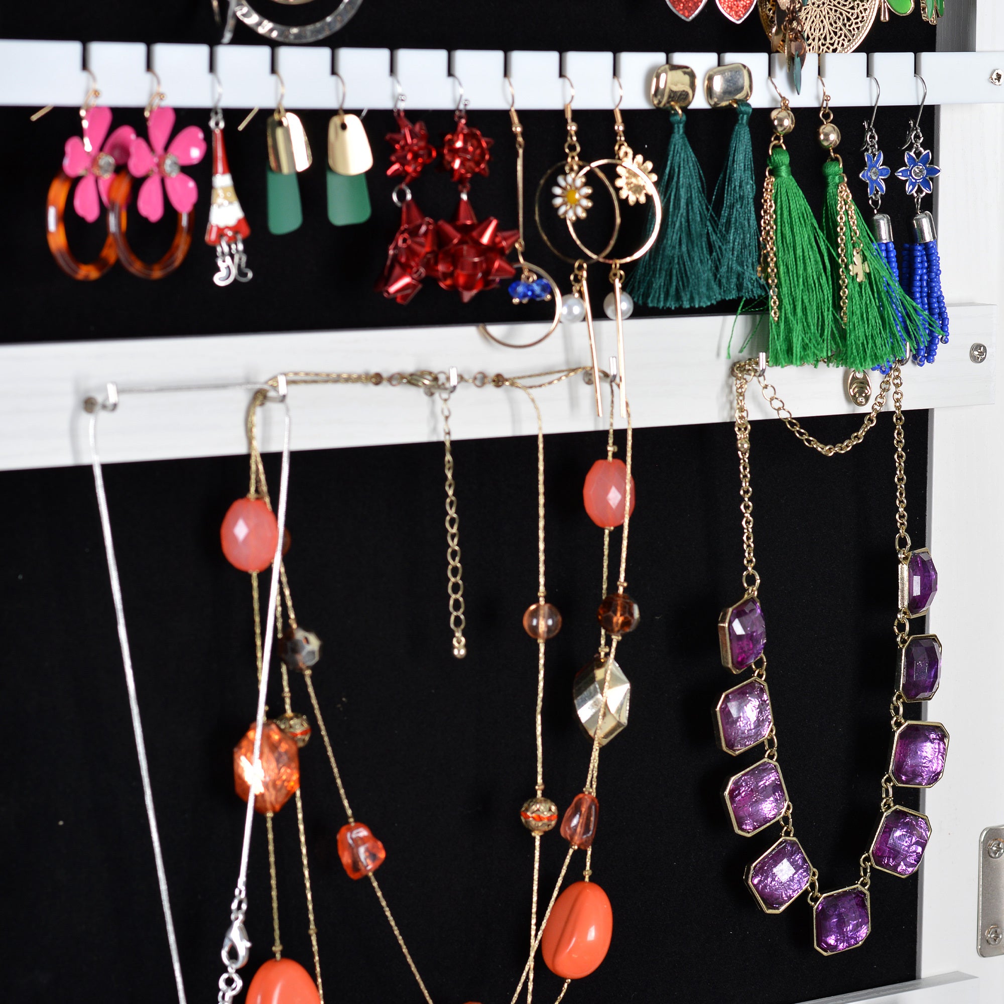 With 22 necklace hooks, 2 cubes, 4 lined shelves, and a bracelet rod, this jewelry cabinet offers plenty of room for rings, earrings, and more.