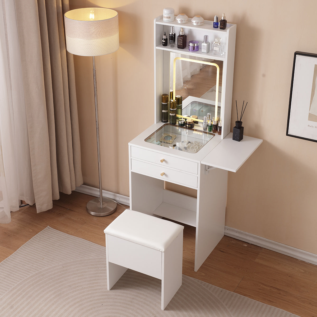 Featuring one open shelf, two smooth-gliding drawers, and a stool with hidden storage, this vanity offers convenient organization for your cosmetics and small items.