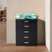 The HAOYYE 5-Drawer Cabinet features a sleek design with black pitted particleboard and a durable triamine coating, paired with tempered glass for a stylish and sturdy storage solution. Its contemporary look effortlessly complements various home decor styles, enhancing your living space.