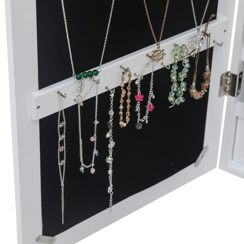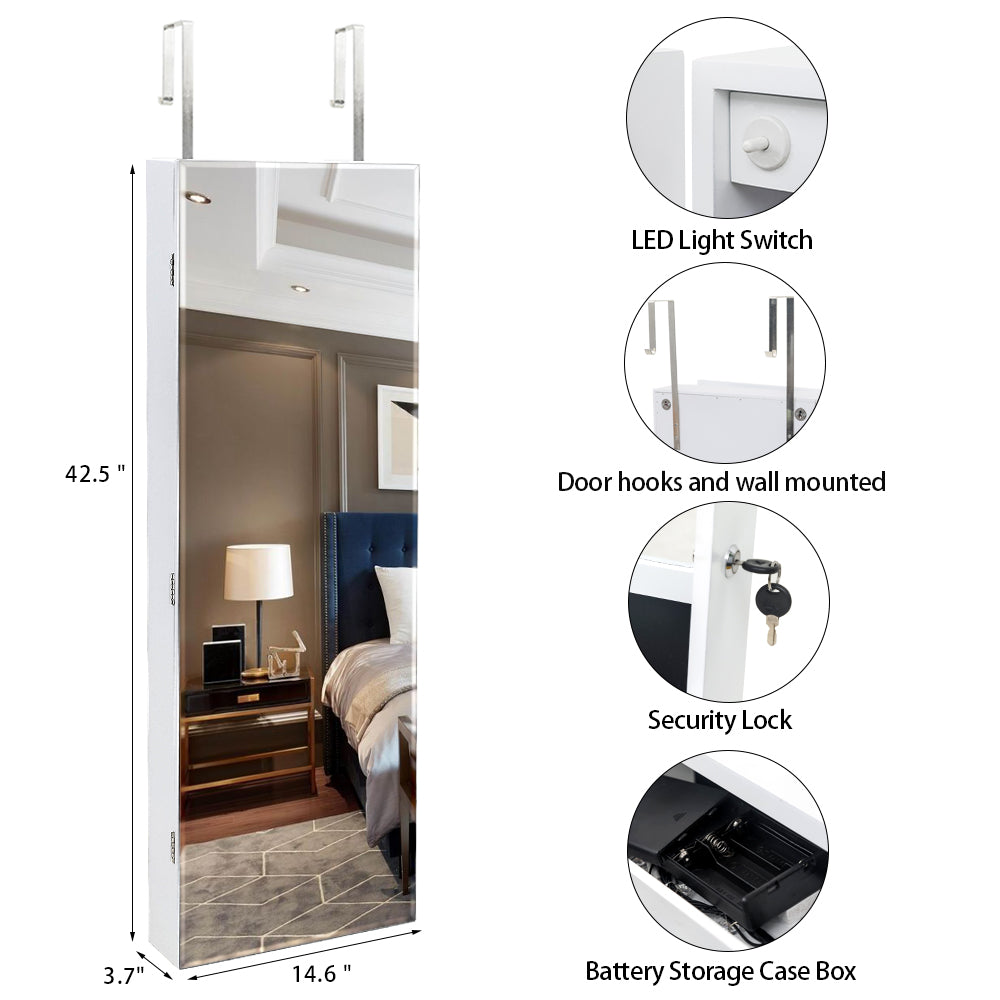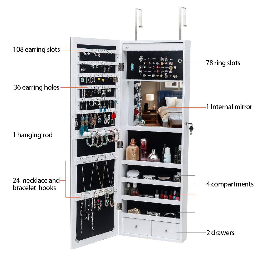 8 detachable blue LED lights brighten your jewelry, making it simple to pick matching pieces even during early mornings or late evenings.Full-length mirror and inner shelves let you try on accessories while checking your complete look before heading out.
