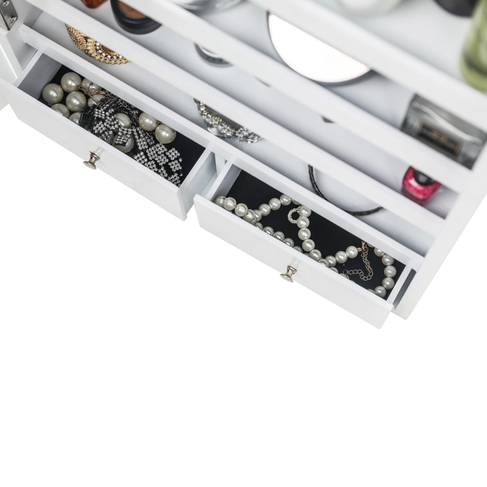Features 4-layer shelves, 2 bottom drawers, 78 ring grooves, and an inner mirror, allowing organized storage of necklaces, bracelets, rings, and earrings while providing a full view when trying on accessories.