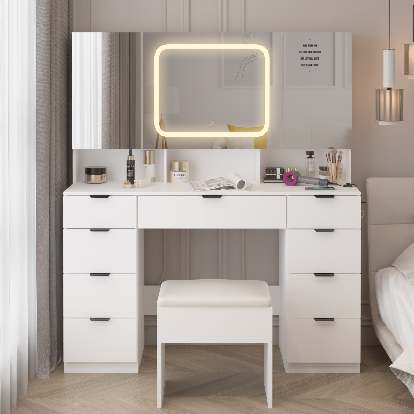 With 3 storage compartments on the tabletop, 9 drawers, 3 tabletop shelves, and 2 staggered tabletops, this vanity offers plenty of organized space for your makeup, skincare, and accessories.