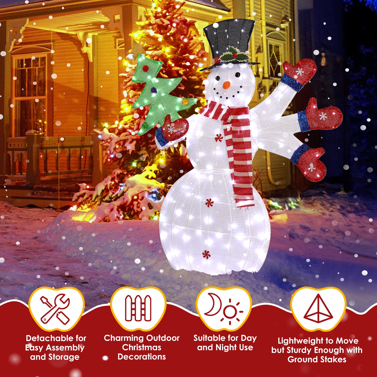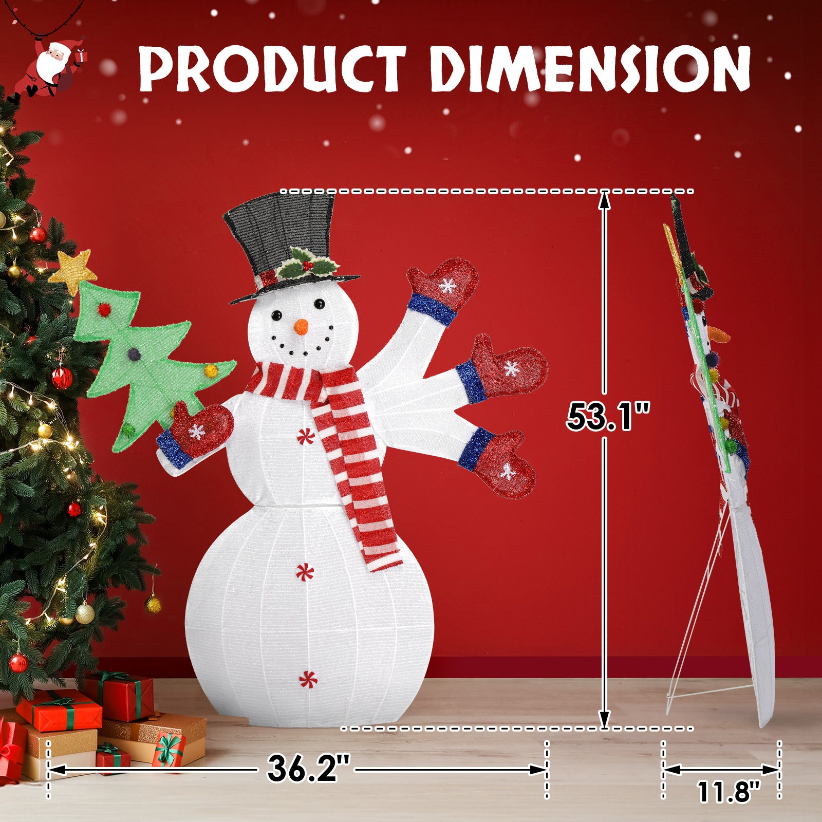 Charming snowman with sparkling tinsel, waving one hand and holding a lighted Christmas tree, adding festive cheer to any indoor or outdoor space.