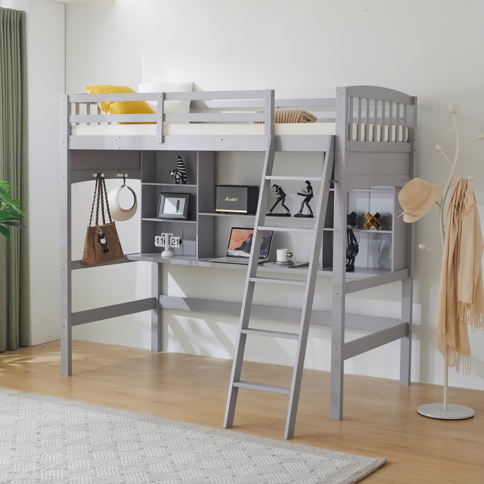 Transform your child’s room with this space-saving gray loft bed. Featuring a built-in shelf and desk, it’s perfect for small spaces, offering a cozy sleep area above and a functional study nook below.