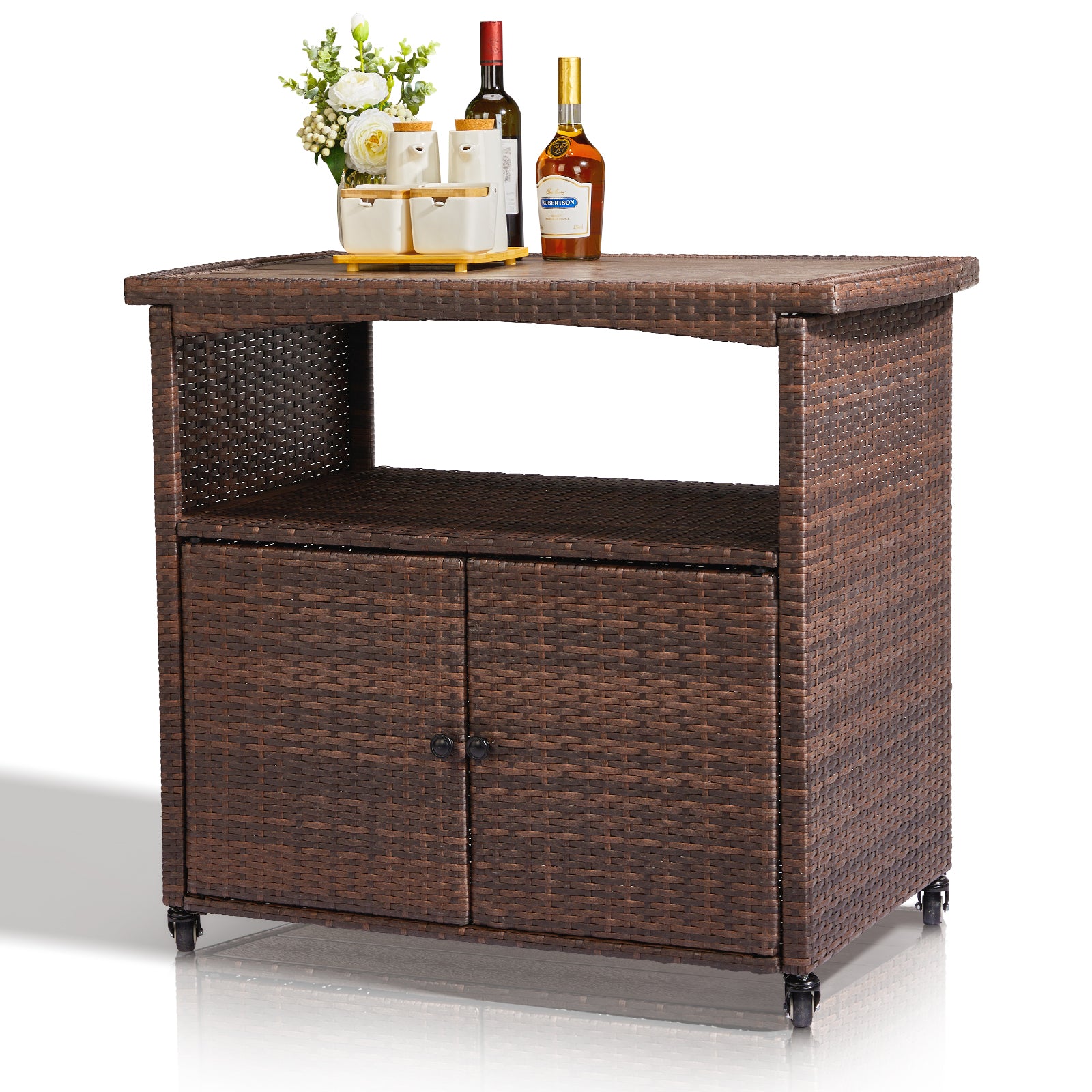 Make outdoor entertaining effortless with this multifunctional bar cart, perfect for patios, gardens, or poolside gatherings. It offers generous storage and a sleek design that blends into any outdoor setup.