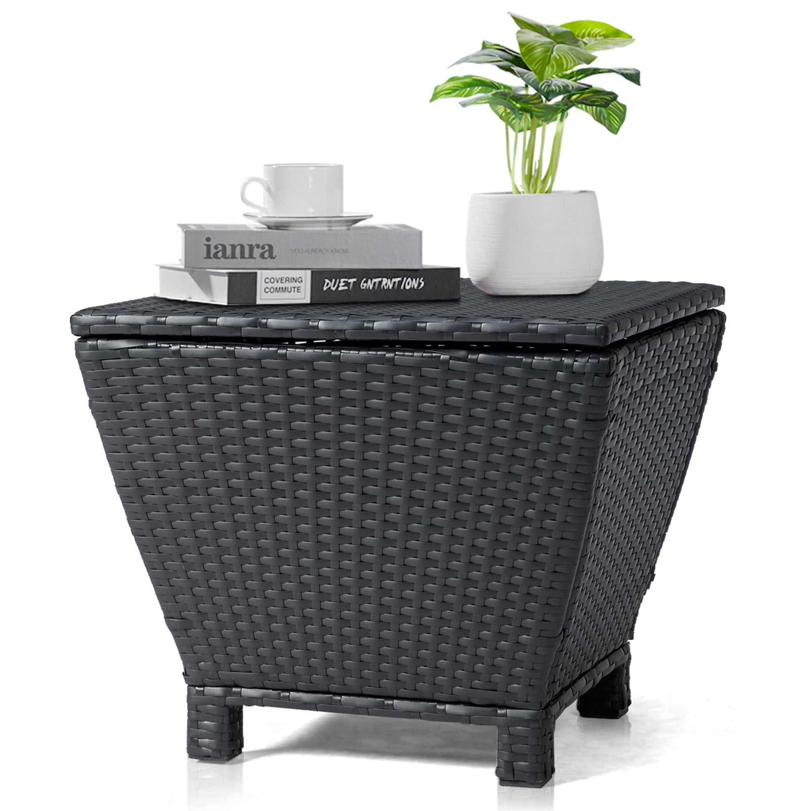 Add charm and functionality to your patio with this stylish PE wicker side table that doubles as hidden storage.