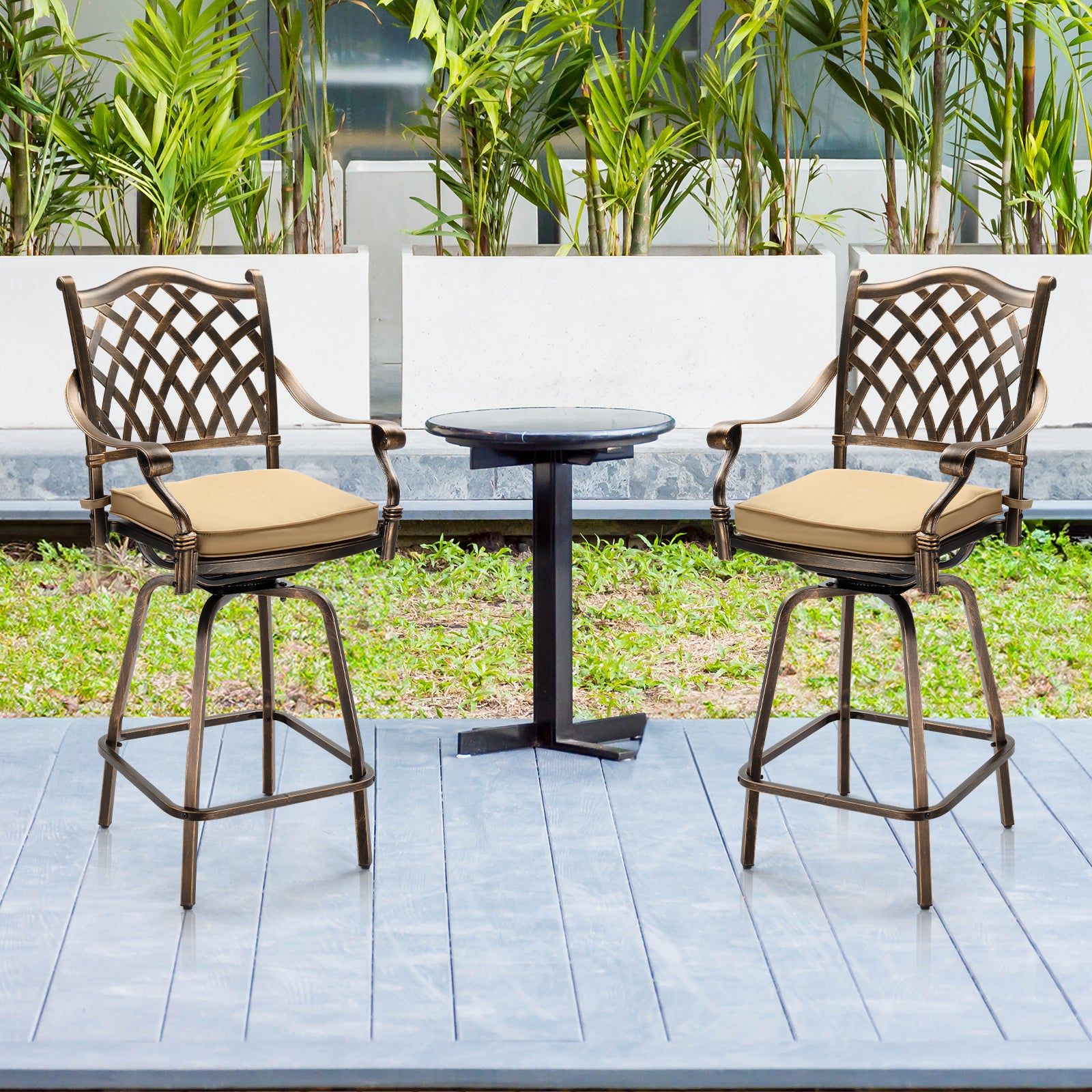 Package Includes: 2 x Cast Aluminum Swivel Bar Stools