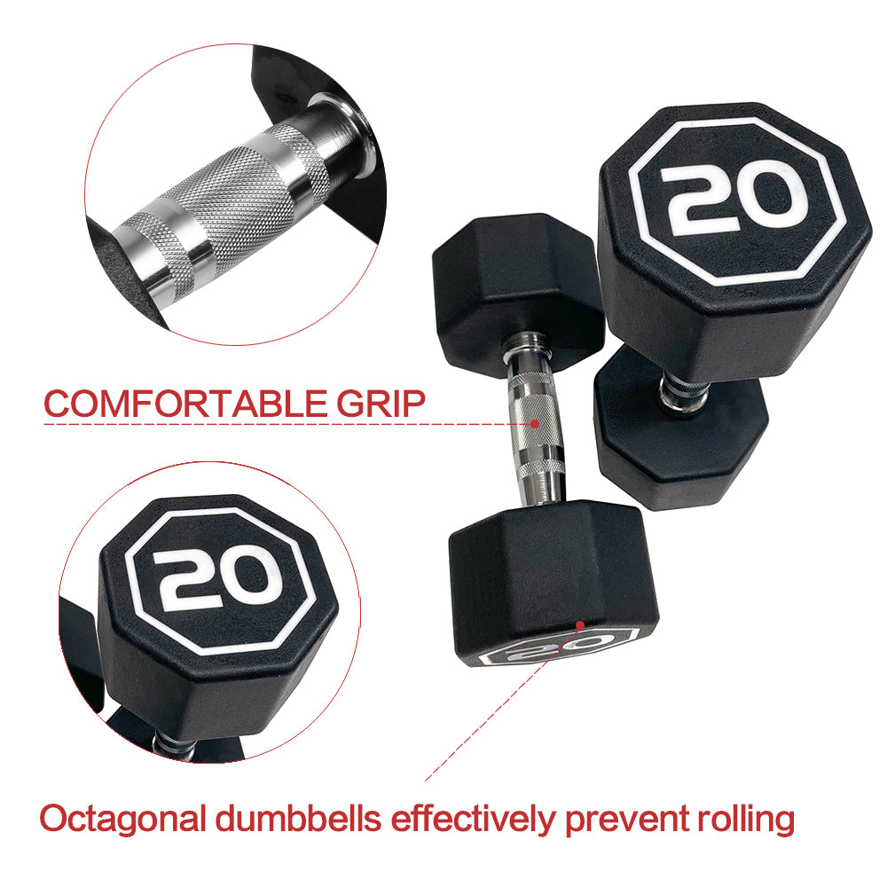Each 20 lbs dumbbell features clear, large number markings for quick weight identification. The octagonal design prevents rolling and saves storage space compared to traditional hex dumbbells.