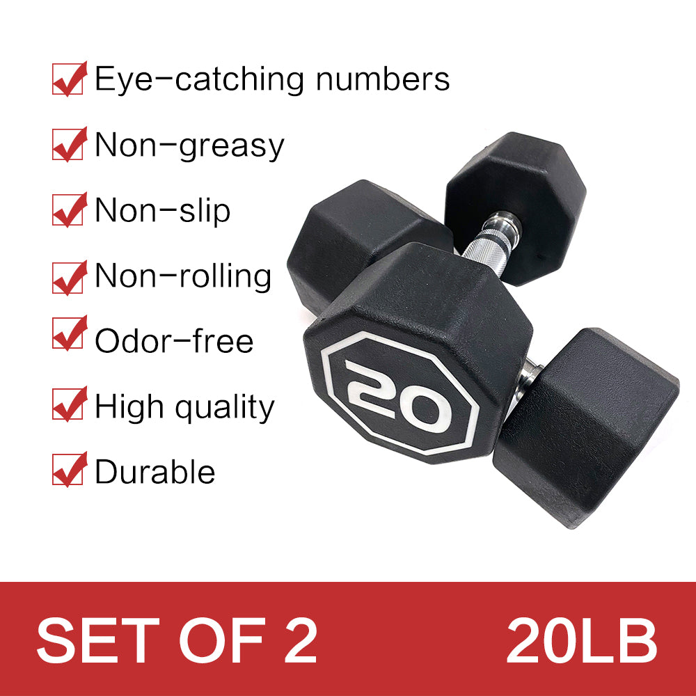 Each 20 lbs dumbbell has large, clear number markings, making it easy to pick the right weight quickly. The octagonal design keeps them from rolling and saves space in your workout area.