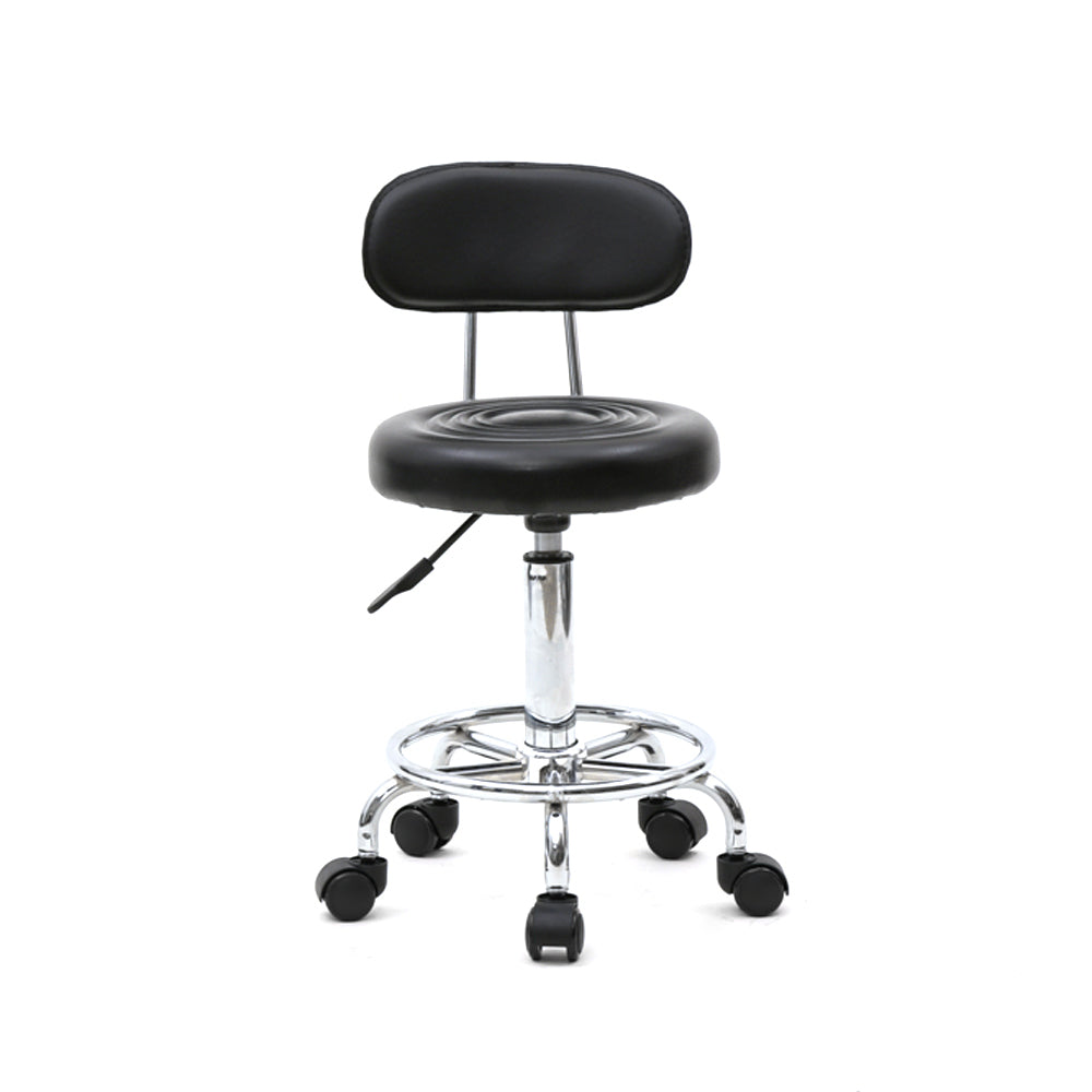 This round adjustable salon stool features a modern design with a comfortable cushioned seat and supportive backrest, ideal for long hours of sitting.