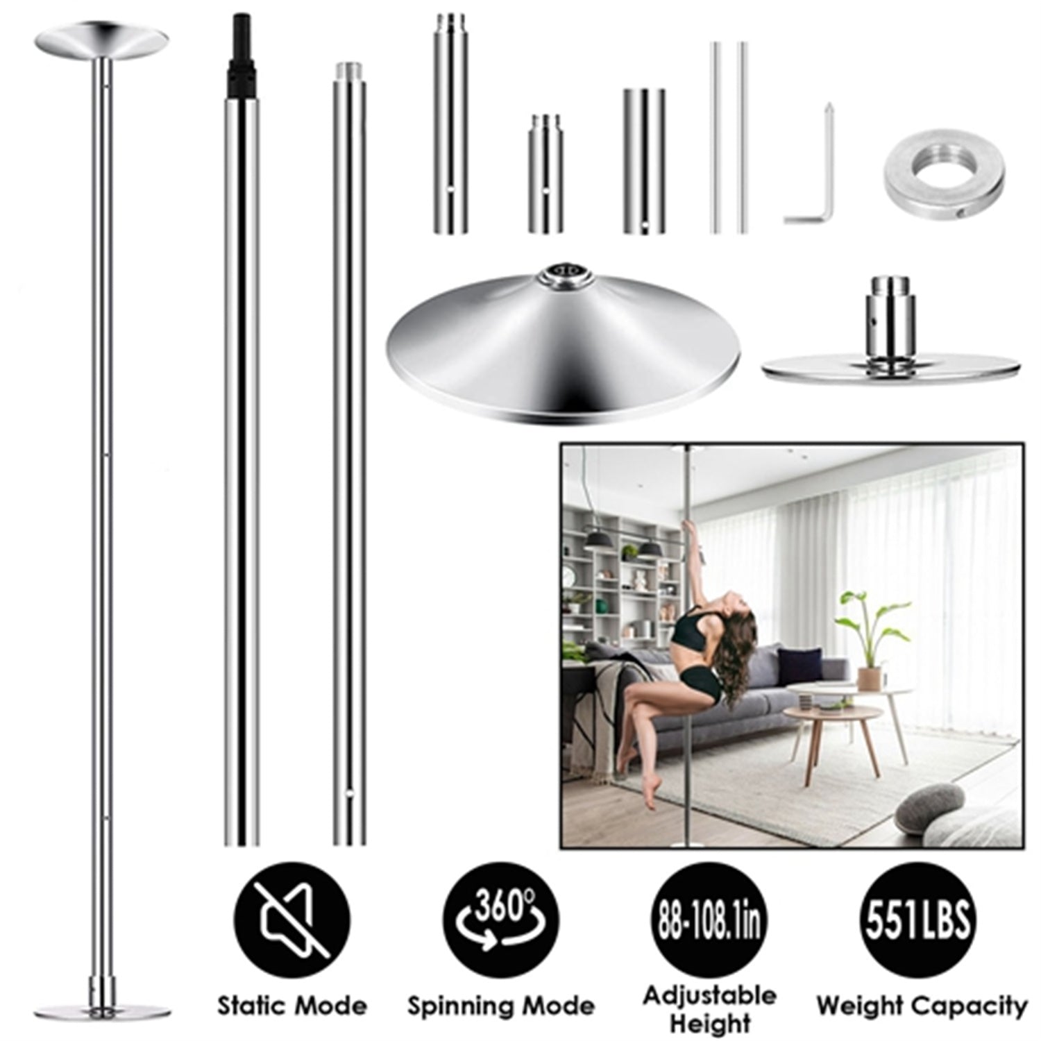 Built from 45 mm seamless steel tubes, this heavy-duty dance pole supports up to 551 lbs, ensuring stability and safety for climbing, spins, and advanced dance techniques.