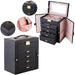 Featuring four pull-out drawers, this organizer offers specialized compartments for different types of jewelry. From earring cards and ring rolls in the first drawer to the deeper bottom drawer for larger pieces, each drawer’s delicate handle allows for smooth, easy access.