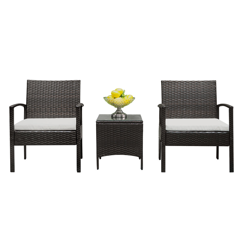 Made with weather-resistant PE wicker and supported by a sturdy iron frame, the two armchairs are paired with plush cushions for all-day comfort. The tempered glass-topped coffee table adds practicality and a modern look, ideal for holding drinks, snacks, or small décor.