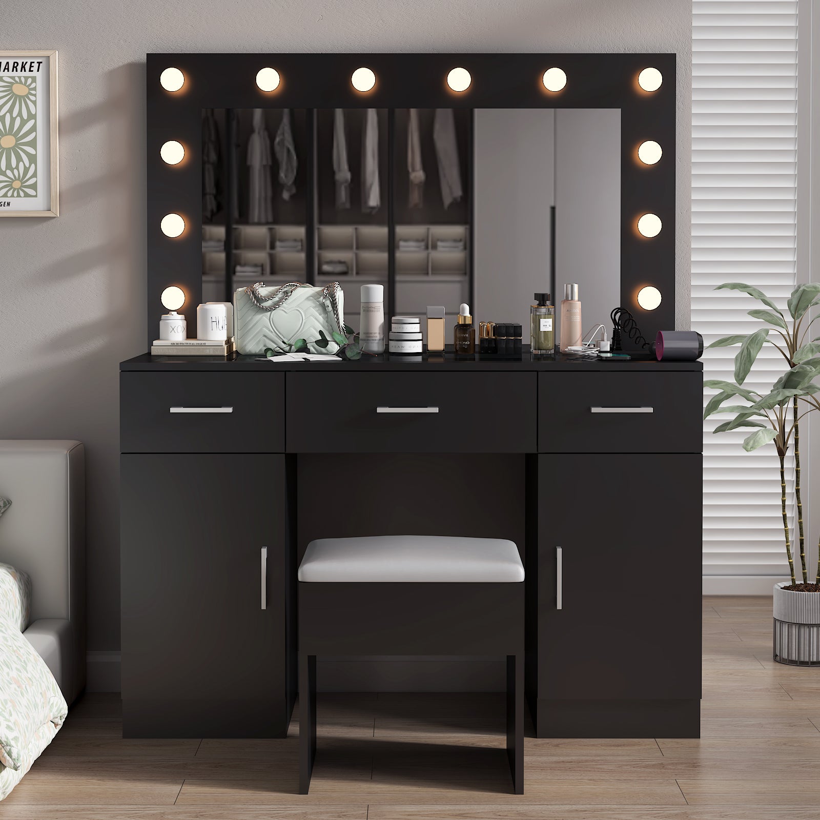 Keep your space organized with three spacious drawers and two large cabinets. Store your makeup, skincare products, hairstyling tools, and jewelry neatly in one stylish vanity set.
