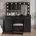 The chic vanity design combines elegance with functionality, complete with a plush cushioned stool that tucks neatly under the table to save space, making it a perfect addition to any bedroom or dressing area.