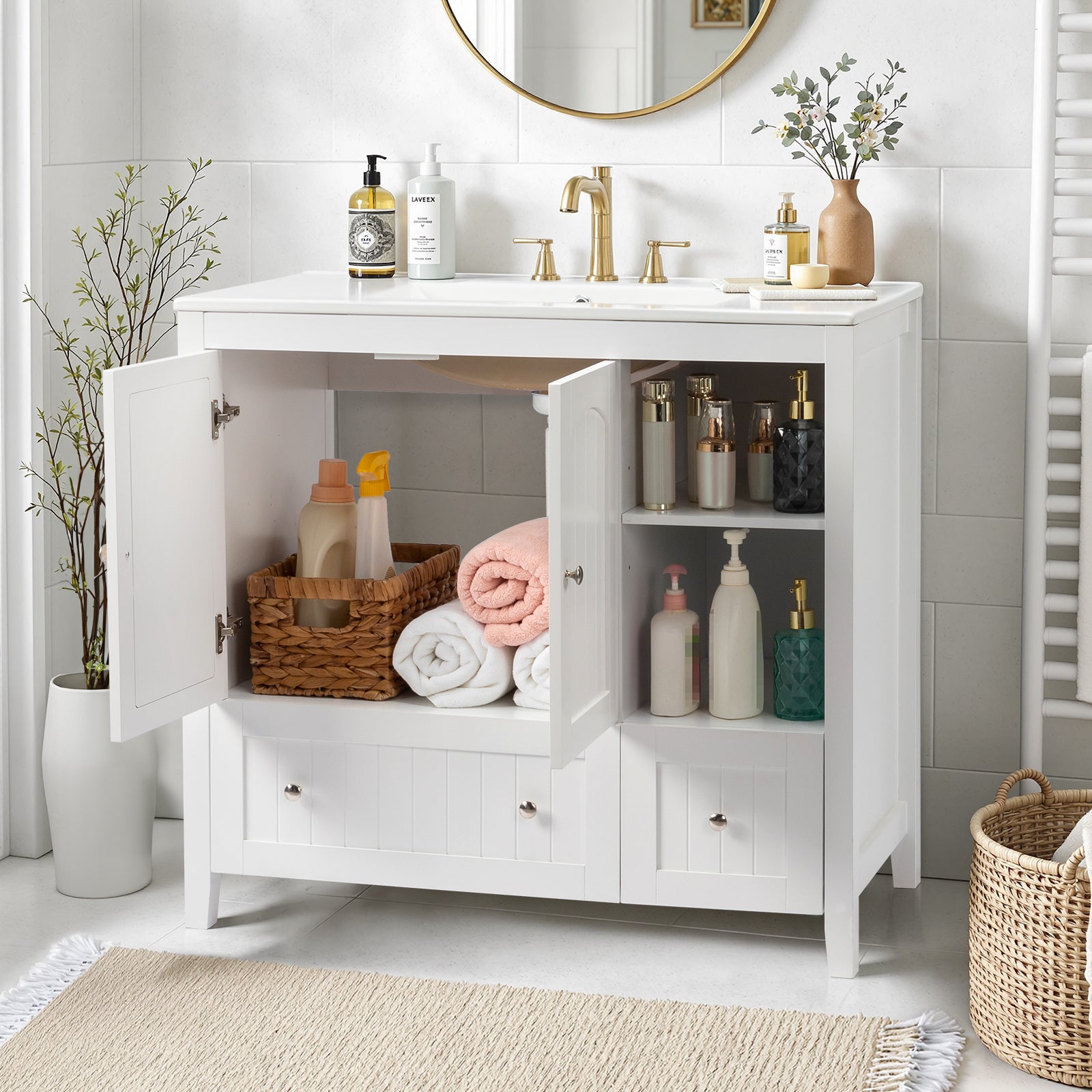 Dual doors and two smooth-gliding drawers offer plenty of room for toiletries, towels, and more. Keep your bathroom neatly organized with thoughtfully designed compartments.